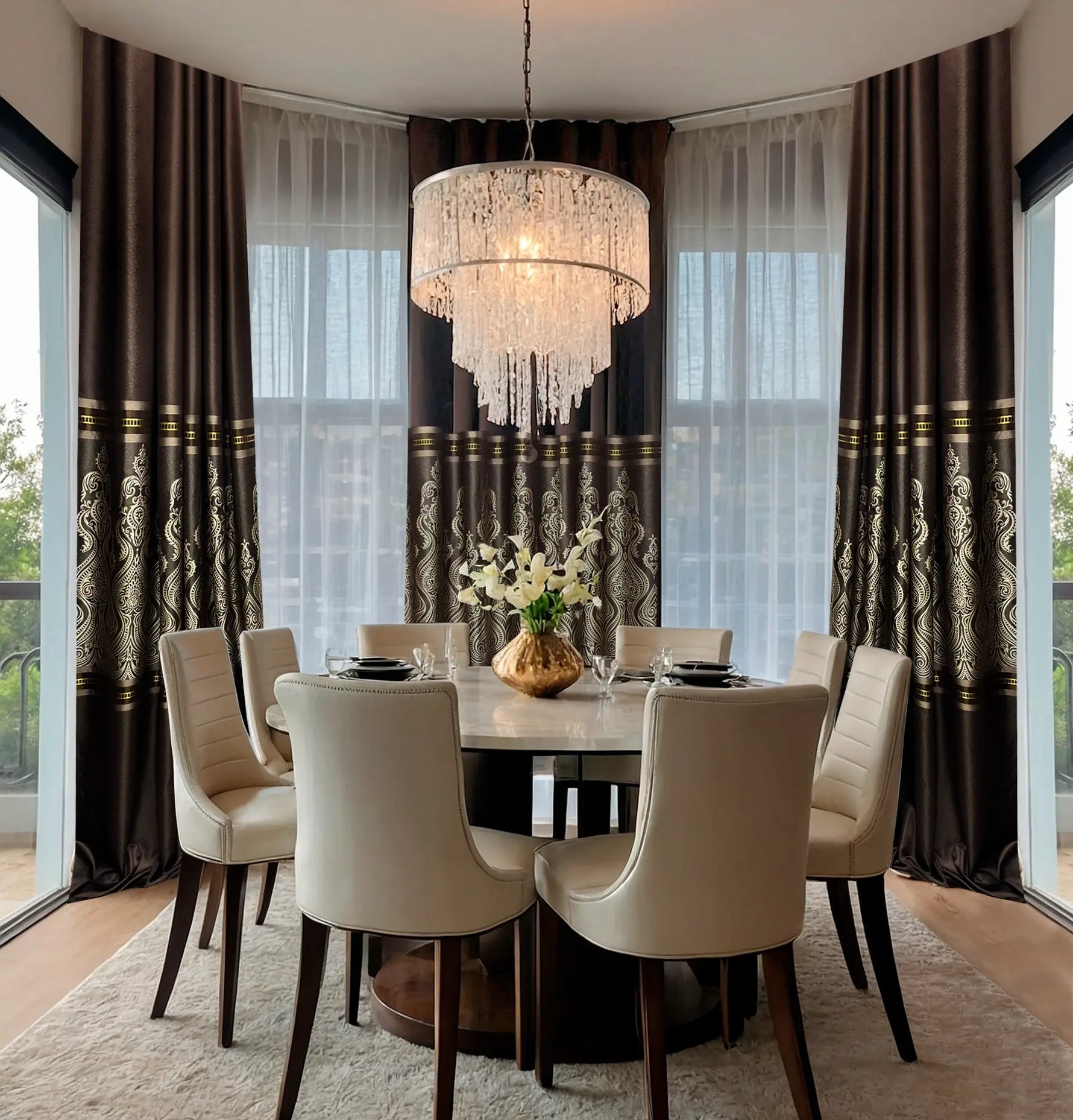 Enhance your bedroom decor with these luxurious custom brown striped damask curtains. Elevate your space with these bohemian extra-long curtain panels that add a modern and stylish touch. Perfect for creating a cozy and chic atmosphere in your home.